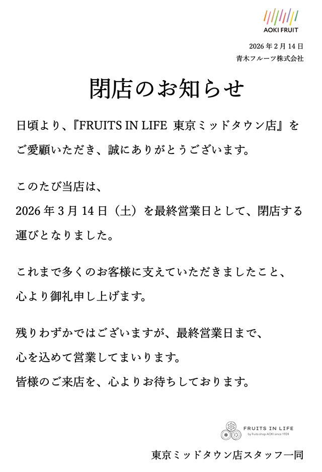 日頃より、『FRUITS IN LIFE 東京ミッドタウン店』をご愛顧いただき、誠にありがとうございます。